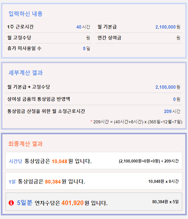 총 5일부의 연차 수당은 401,920원으로 나왔습니다.